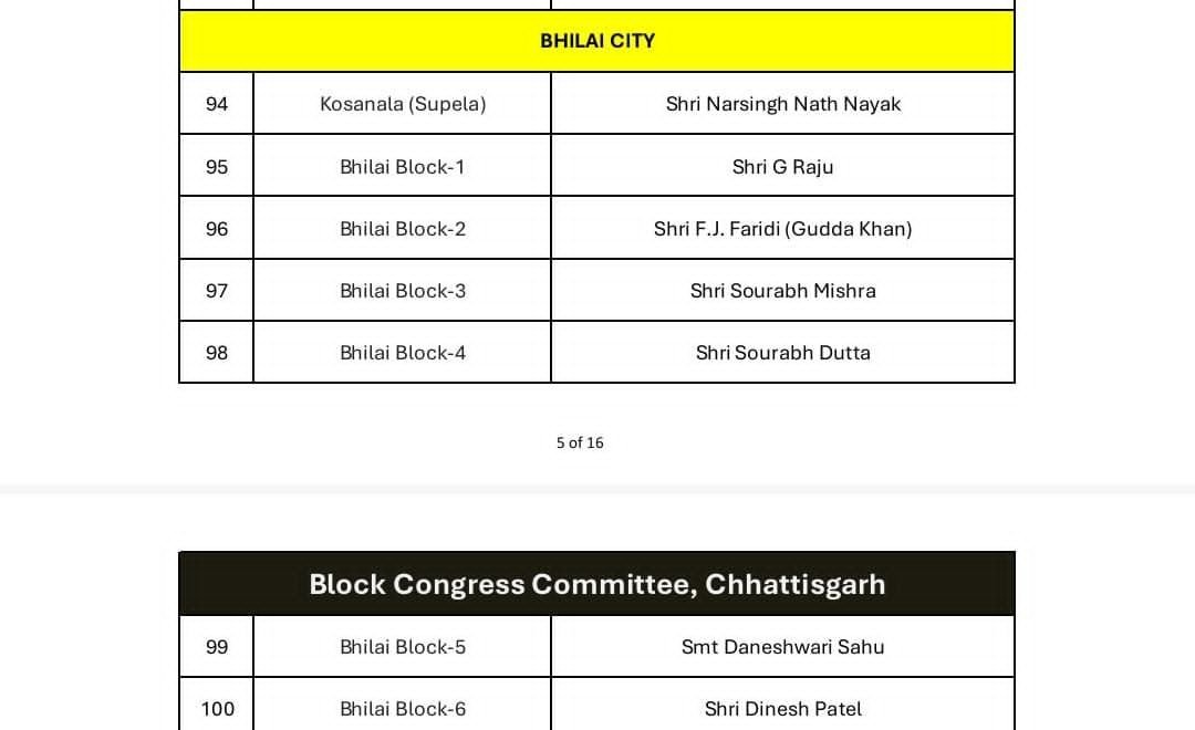 भिलाई शहर जिला: राजनीतिक-सामाजिक संरचना का खास ध्यान देते हुए ब्लॉक अध्यक्षों की नियुक्ति की गई है