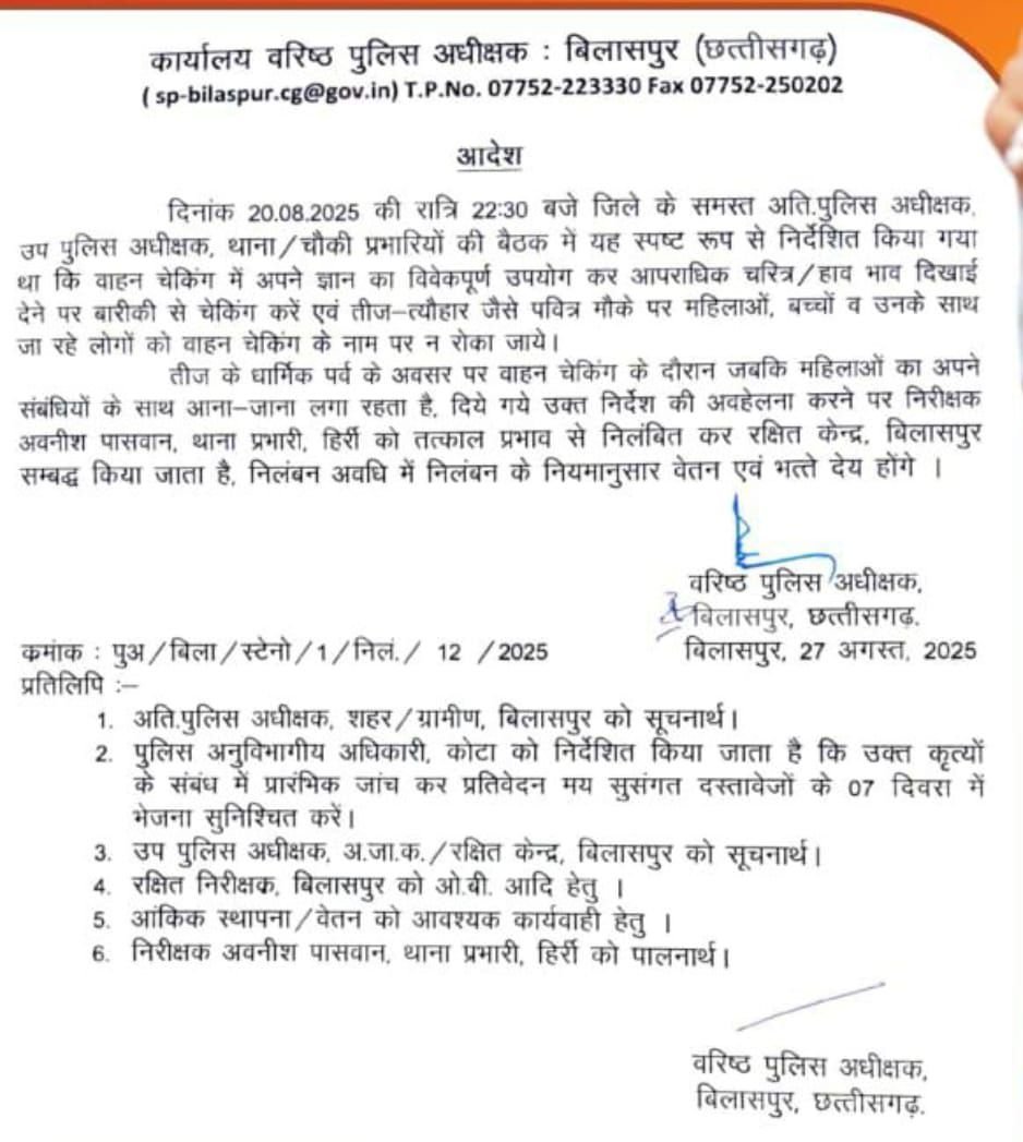 तीज के धार्मिक पर्व के अवसर पर वाहन चेकिंग के दौरान जबकि महिलाओं का अपने संबंधियों के साथ आना-जाना लगा रहता है, दिये गये उक्त निर्देश की अवहेलना करने पर निरीक्षक अवनीश पासवान, थाना प्रभारी, हिरों को तत्काल प्रभाव से निलंबित कर रक्षित केन्द्र, बिलासपुर सम्बद्ध किया जाता है, निलंबन अवधि में निलंबन के नियमानुसार वेतन एवं भत्ते देय होंगे ।