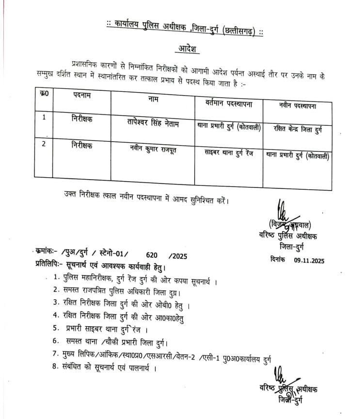 वरिष्ठ पुलिस अधीक्षक विजय अग्रवाल ने दुर्ग कोतवाली के थाना प्रभारी तापेश्वर सिंह नेताम को लाइन अटैच किया…. इंस्पेक्टर नवीन कुमार राजपूत दुर्ग कोतवाली के नए थाना प्रभारी होंगे