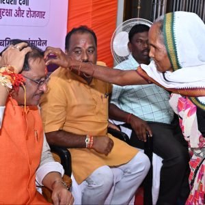 जशपुर 09 अगस्त 2025/मुख्यमंत्री विष्णु देव साय के गृह ग्राम बगिया स्थित कैंप कार्यालय में रक्षाबंधन के अवसर पर विभिन्न योजनाओं से लाभान्वित बहनों ने राखी बांधकर आभार व्यक्त किया। प्रधानमंत्री आवास योजना, महतारी वंदन योजना की हितग्राही दीदियों के साथ आंगनबाड़ी कार्यकर्ता-सहायिकाएँ, मितानिन और स्व-सहायता समूह की बहनों ने भी मुख्यमंत्री श्री साय की कलाई पर राखी बांधी और उनके दीर्घायु की कामना की।