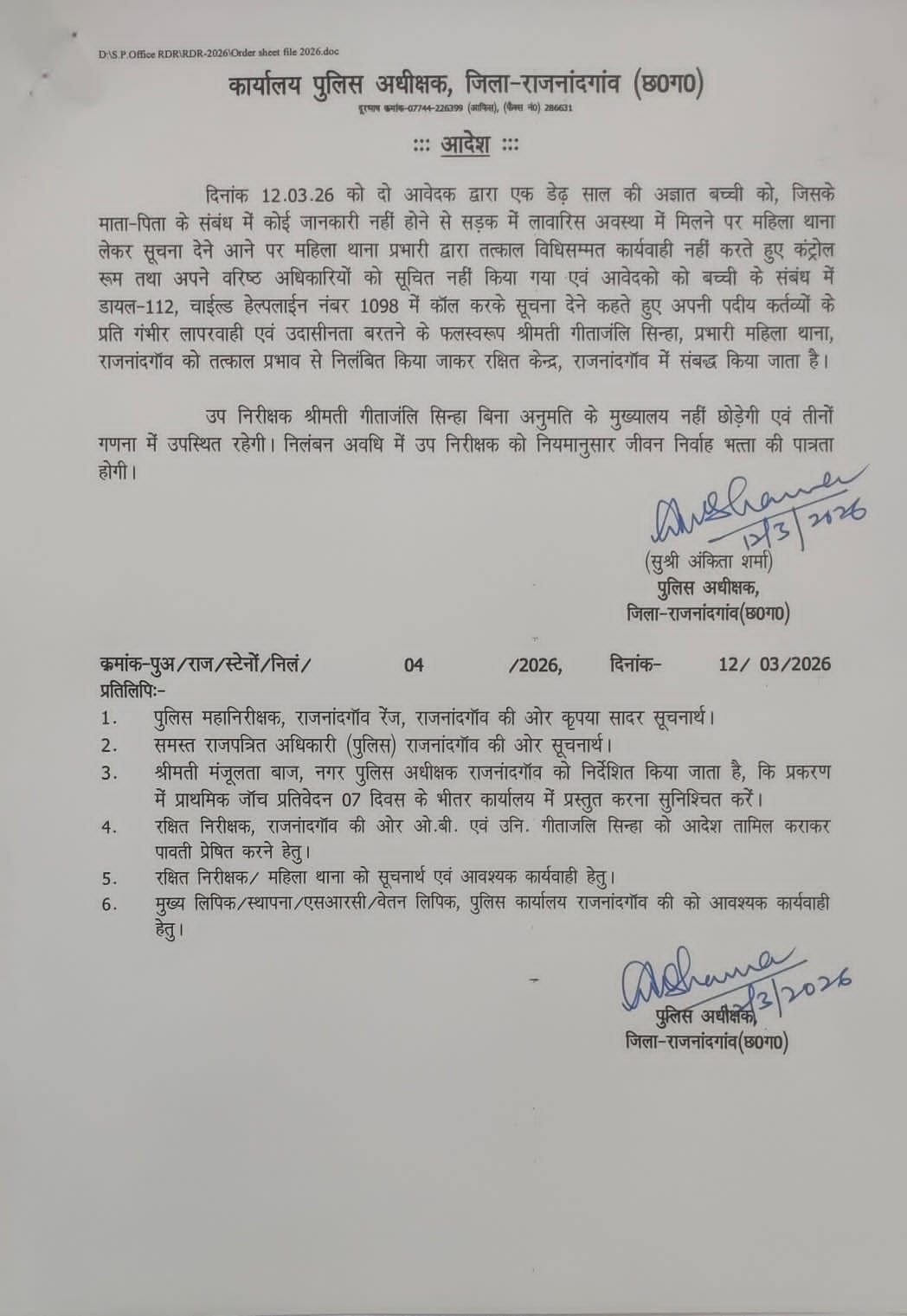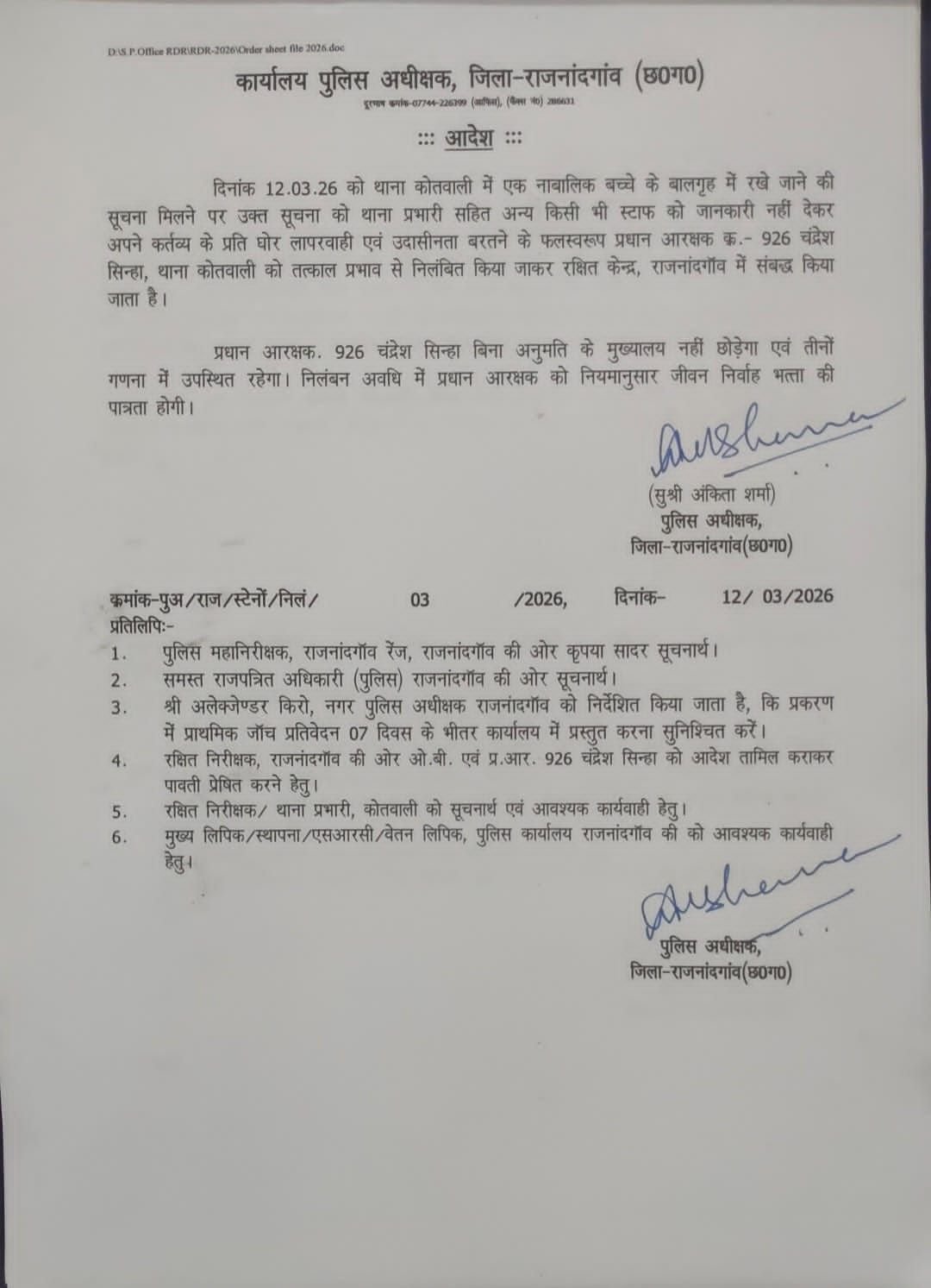 12.03.26 को थाना कोतवाली में एक नाबालिक बच्चे के बालगृह में रखे जाने की सूचना मिलने पर उक्त सूचना को थाना प्रभारी सहित अन्य किसी भी स्टाफ को जानकारी नहीं देकर अपने कर्तव्य के प्रति घोर लापरवाही एवं उदासीनता बरतने के फलस्वरूप श्रीमती गीताजंलि सिन्हा, प्रभारी महिला थाना, राजनांदगाँव व कोतवाली थाना में तैनात प्रधान आरक्षक 926 चंद्रेश सिंन्हा को तत्काल प्रभाव से निलंबित किया जाकर रक्षित केन्द्र, राजनांदगाँव में संबद्ध किया जाता है।