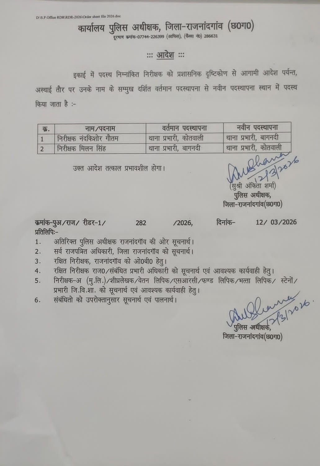 पुलिस अधीक्षक सुश्री अंकिता शर्मा ने प्रशासनिक दृष्टिकोण से कोतवाली के थाना प्रभारी निरीक्षक नंदकिशोर गौतम को कोतवाली थाना से हटाकर बागनदी थाने का प्रभाव दिया गया है वहीं  निरीक्षक मिलन सिंह को थाना प्रभारी बागनदी से थाना प्रभारी राजनांदगांव कोतवाली का प्रभार सौपा गया है।