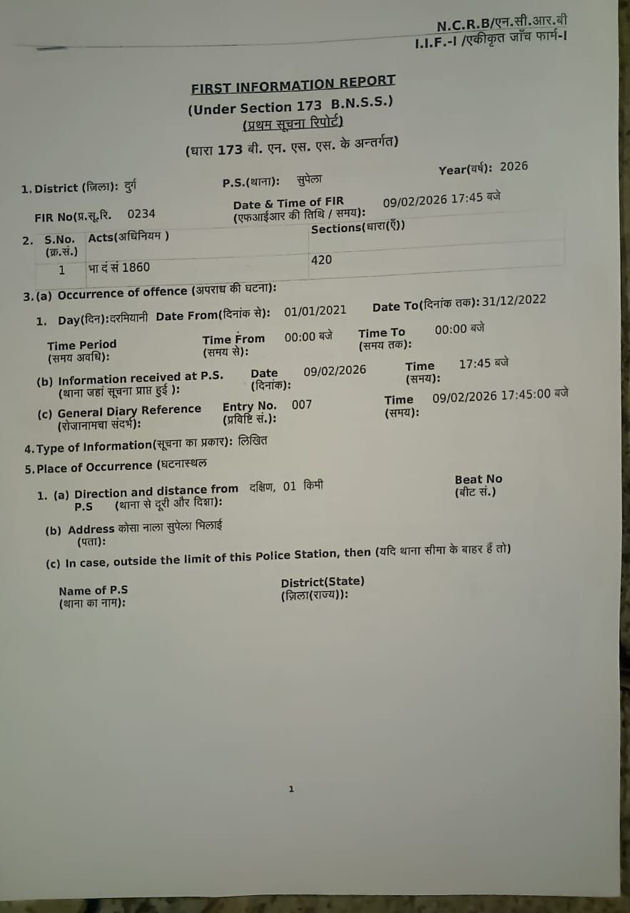 भिलाई नगर,10 फरवरी 2026:-  पुस्तैनी जमीन बेंच कर बच्चों की सरकारी नौकरी लगवाने के झांसे में आए बालोद के किसान ने रूपये के लेन-देन और आरोपी से हुई बातचीत के कई डिजिटल साक्ष्य प्रस्तुत कर दुर्ग जिले के सुपेला थाना में एफआईआर दर्ज करवाई है। इस मामले में आरोपी जयप्रकाश यादव निवासी कोसा नगर भिलाई के खिलाफ धारा 420 के तहत अपराध पंजीबद्ध कर पुलिस विवेचना में लिया गया है।