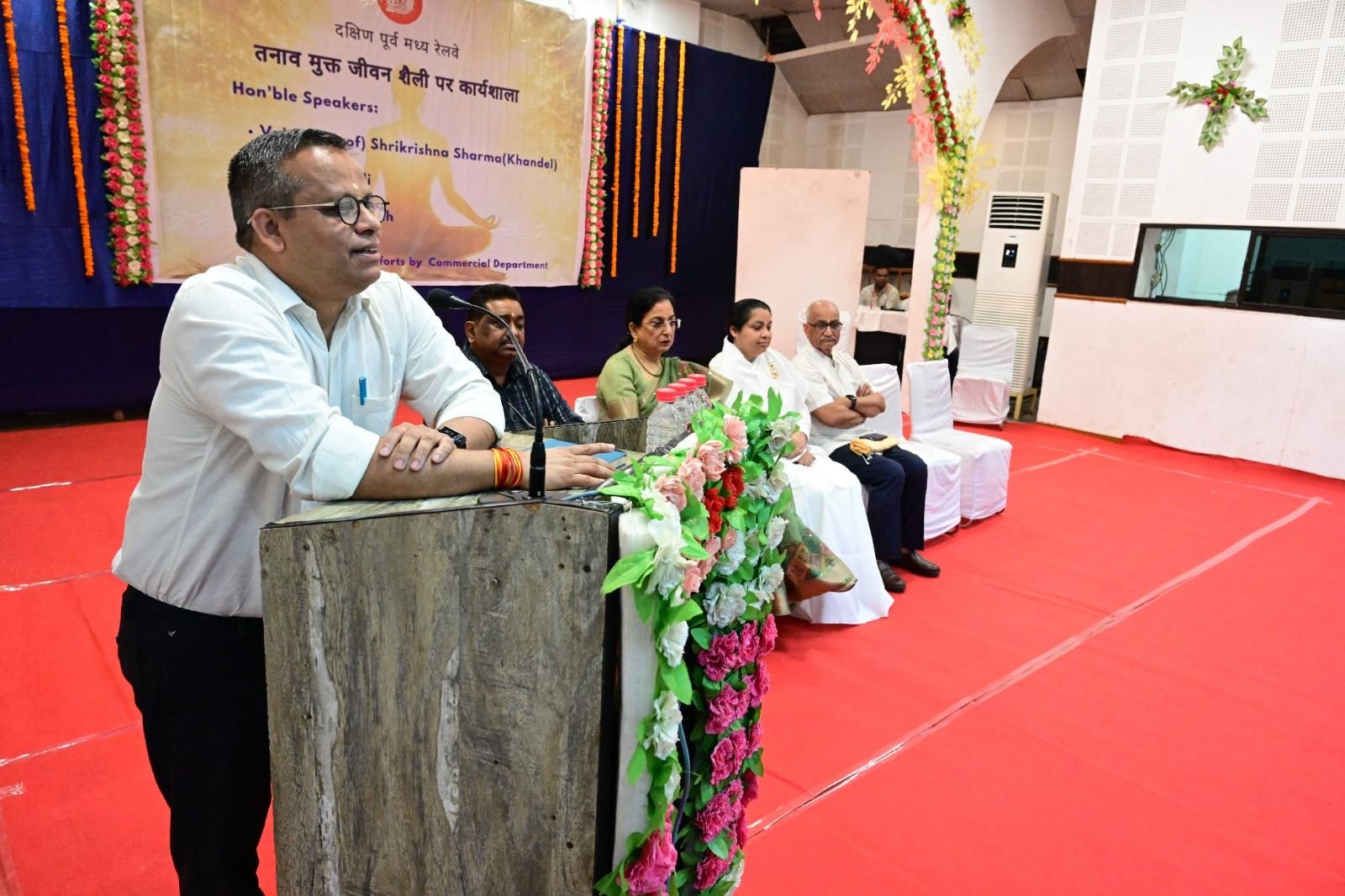बिलासपुर, 14 अक्टूबर 2025 :- दक्षिण पूर्व मध्य रेलवे, बिलासपुर के एन. ई. इंस्टीट्यूट में आज 14 अक्टूबर 2025 को “तनाव-मुक्त जीवन शैली” विषय पर एक प्रेरणादायक कार्यशाला का सफल आयोजन किया गया । इस कार्यशाला का उद्देश्य रेलवे कर्मचारियों एवं अधिकारियों को मानसिक स्वास्थ्य, संतुलित जीवन शैली तथा सकारात्मक सोच के महत्व से अवगत कराना था ।कार्यक्रम का शुभारंभ प्रधान मुख्य वाणिज्य प्रबंधक प्रवीण पाण्डेय के करकमलों द्वारा दीप प्रज्वलन एवं उद्घाटन संबोधन से हुआ । अपने संबोधन में उन्होंने कहा कि—