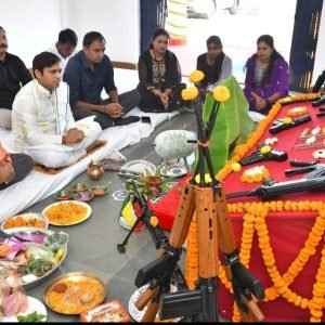 मुंगेली 12 अक्टूबर 2024 :- पुलिस अधीक्षक भोजराम पटेल ने विजयादशमी के अवसर पर पुलिस लाइन में जवानों के साथ कि शस्त्र पूजा आज विजयादशमी के पावन अवसर पर प्रतिवर्ष की भांति विजयादशमी के अवसर पर रक्षित केन्द्र मुंगेली (पुलिस लाईन) में विधिविधान से शस्त्र पूजा का आयोजन किया गया