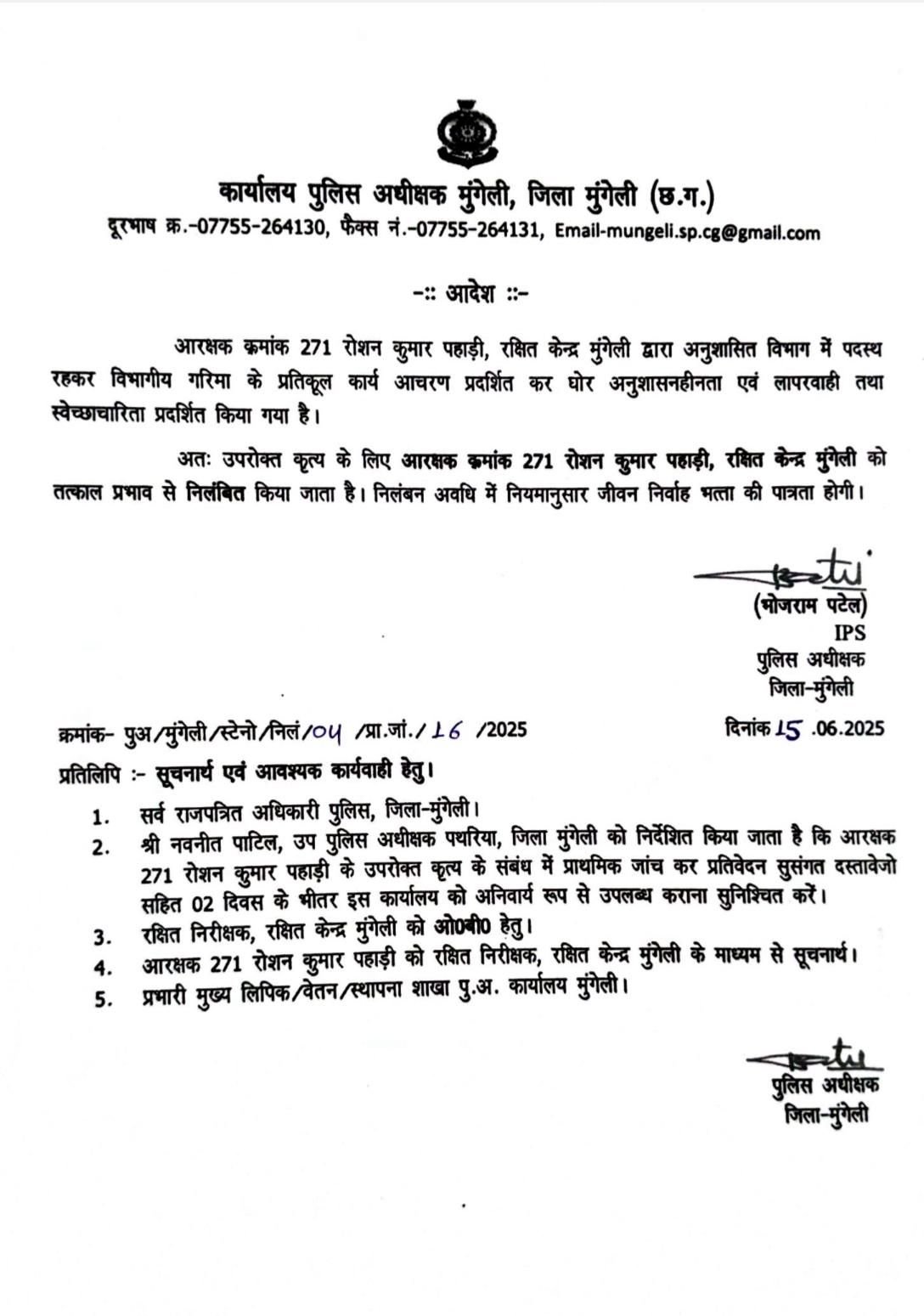 पुलिस अधीक्षक के द्वारा ड्यूटी में लापरवाही एवं अनुशासनहीनता करने वाले आरक्षक को किया गया निलंबित एवं दिये विभागीय जांच के आदेश