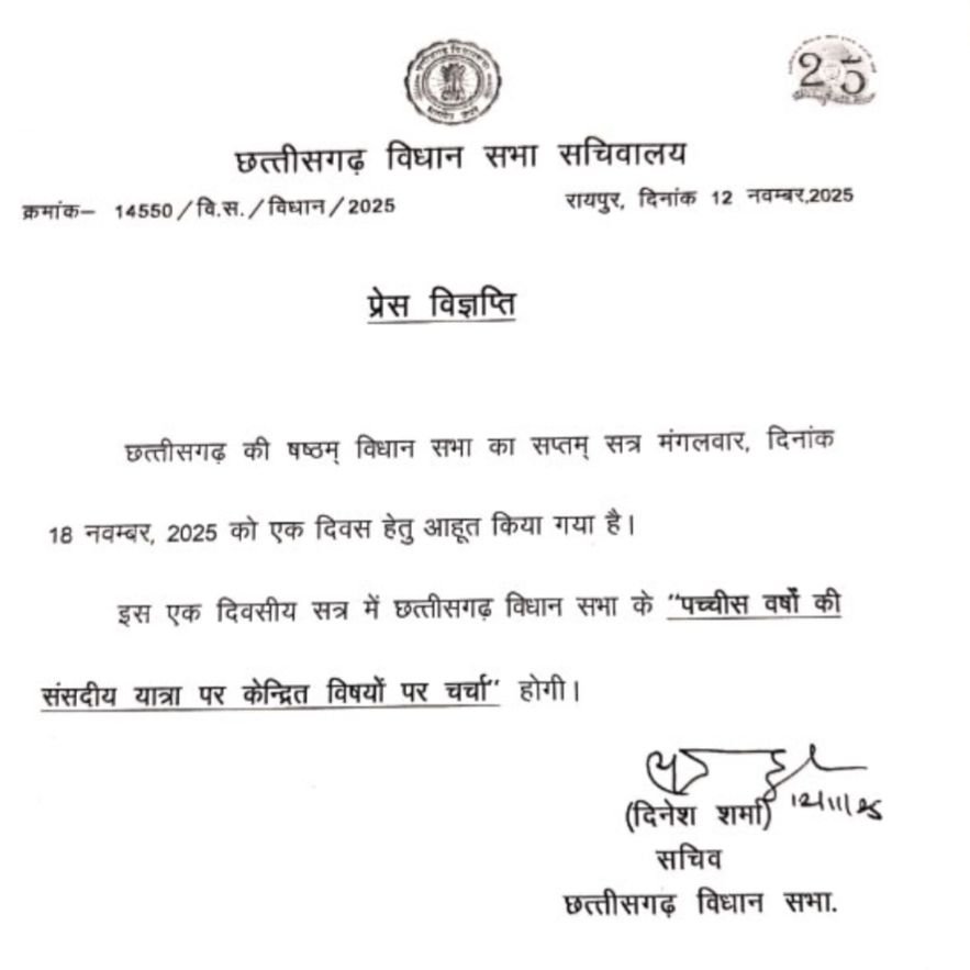 छत्तीसगढ़ की षष्ठम् विधान सभा का सप्तम् सत्र मंगलवार,18 नवम्बर, 2025 को एक दिवस हेतु आहूत किया गया है।