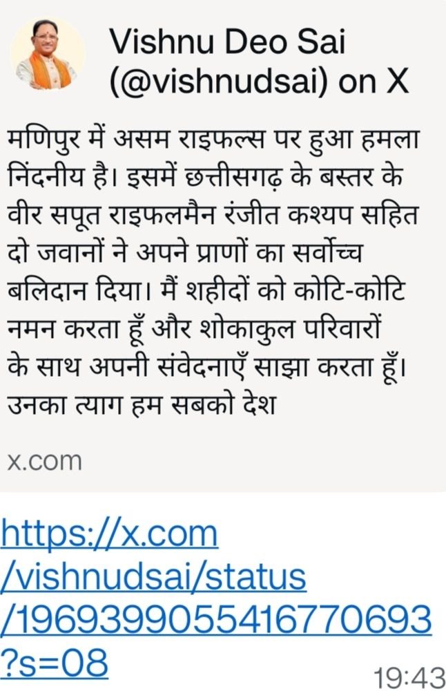रायपुर, 21 सितम्बर 2025/ मुख्यमंत्री विष्णुदेव साय ने मणिपुर में असम राइफल्स पर हुए कायरतापूर्ण हमले की कड़े शब्दों में निंदा की है। इस हमले में छत्तीसगढ़ के बस्तर के वीर सपूत राइफलमैन रंजीत कश्यप सहित दो जवानों ने अपने प्राणों का सर्वोच्च बलिदान दिया।