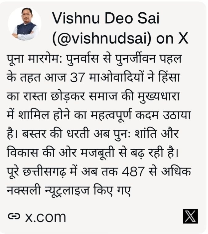 मुख्यमंत्री श्री विष्णुदेव साय ने आज के आत्मसमर्पण का स्वागत करते हुए कहा कि बस्तर की धरती अब पुनः शांति, स्थिरता और विकास की ओर मजबूती से अग्रसर है। उन्होंने कहा कि छत्तीसगढ़ में सुरक्षा बलों की सतत कार्रवाई, प्रशासनिक समन्वय और सरकार की पुनर्वास-केंद्रित नीतियों के कारण माओवादी हिंसा के खिलाफ निर्णायक सफलता प्राप्त हो रही है।