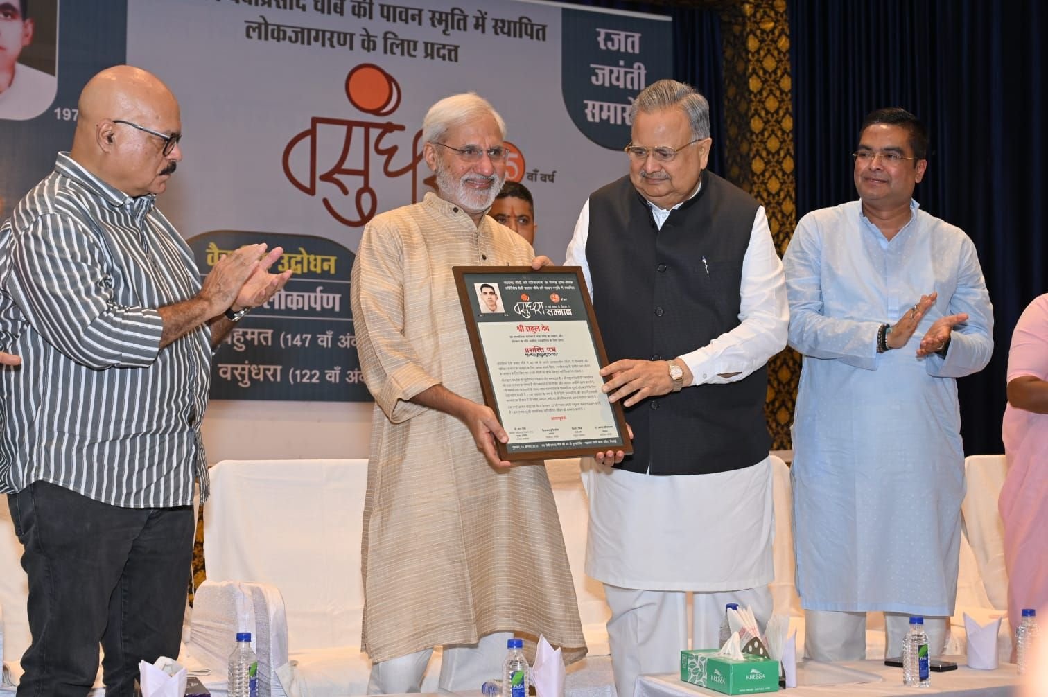 महात्मा गांधी कला मंदिर भिलाई में आयोजित वसुंधरा सम्मान के रजत जयंती समारोह मे उपरोक्त वक्तव्य समारोह के मुख्य अतिथि डा. रमन सिंह ने दिया. समारोह का आयोजन लोकजागरण की संस्था वसुंधरा के द्वारा श्री चतुर्भुज मेमोरियल फाउंडेशन तथा बी एस पी आफिसर्स एसोसिएशन के सहयोग से किया गया.इस अवसर पर डा. रमन सिंह ने सामाजिक सरोकारों तथा भाषा के स्वरुप और संस्कार के प्रति संजीदा पत्रकारिता के लिए सुपरिचित पत्रकार राहुल देव को पच्चीसवां वसुंधरा सम्मान प्रदान किया. राहुल देव को शाल श्रीफल, प्रशस्ति पत्र और सम्मान निधि देकर सम्मानित किया गया.