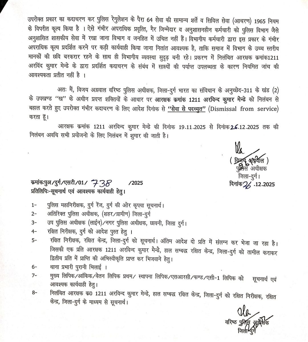 निलंबित आरक्षक अरविन्द कुमार मेन्ढे बर्खास्त