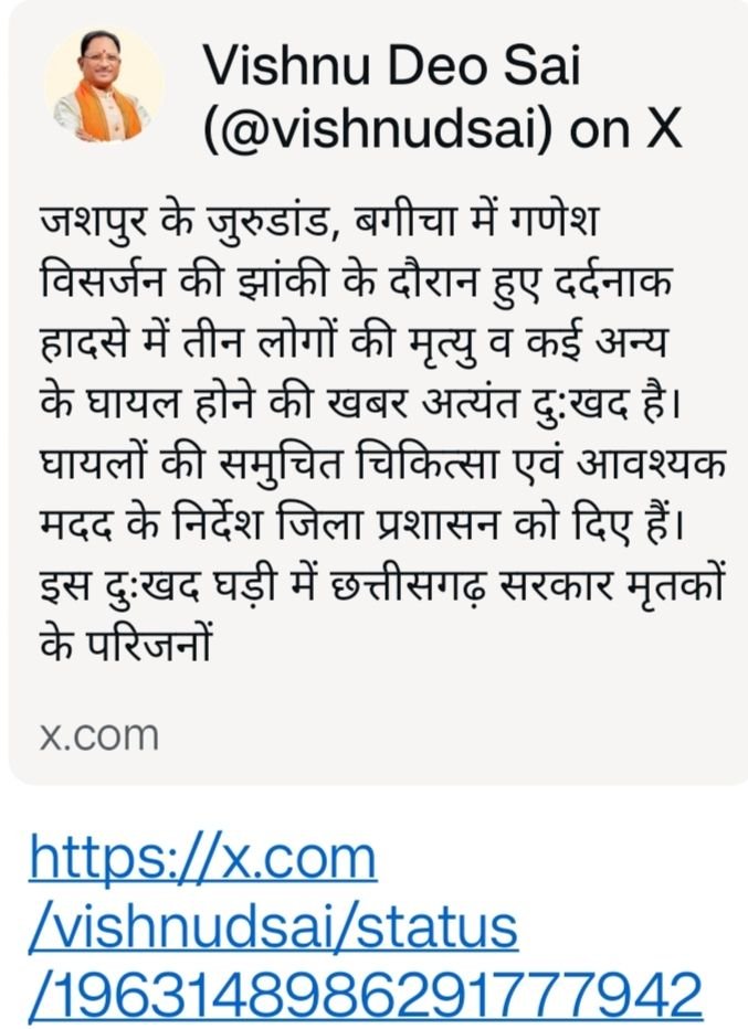 रायपुर, 03 सितम्बर 2025/ जशपुर जिले के बगीचा विकासखंड के जुरुडांड में गणेश विसर्जन की झांकी के दौरान हुए दर्दनाक हादसे में तीन लोगों की मृत्यु एवं कई अन्य लोगों के घायल होने की घटना पर मुख्यमंत्री विष्णु देव साय ने गहरा दुःख व्यक्त किया है।