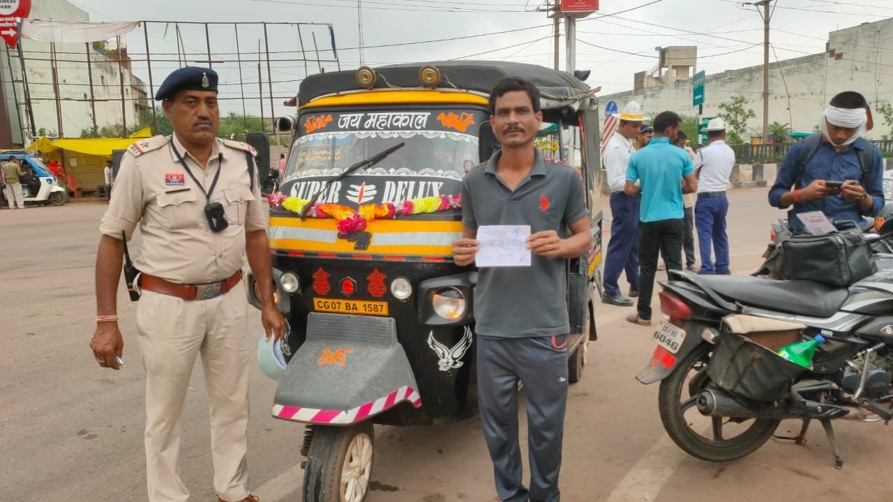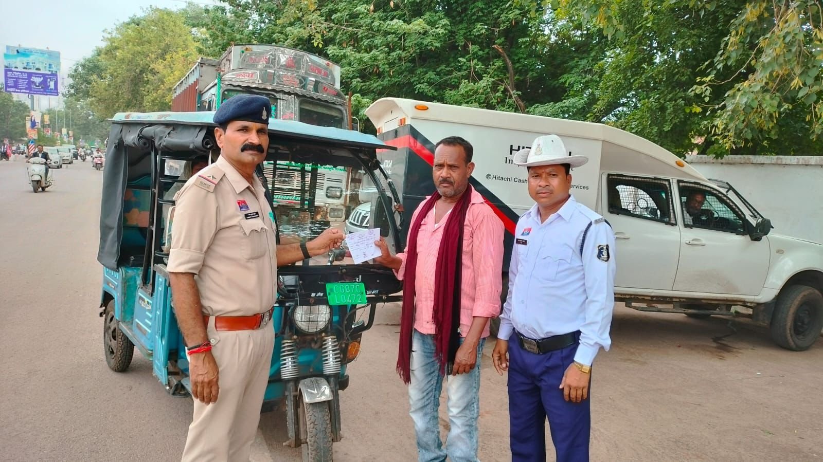 दुर्ग 24 जून 2025:- 01 दिन पूर्व ई रिक्शा एवं ऑटो चालको को वर्दी पहने, क्षमता से अधिक सवारी ना बैठाने, बिना लाससेंस वाहन ना चलाने एवं यातायात नियम का पालन कर वाहन चलाने समझाईस दी गई थी।