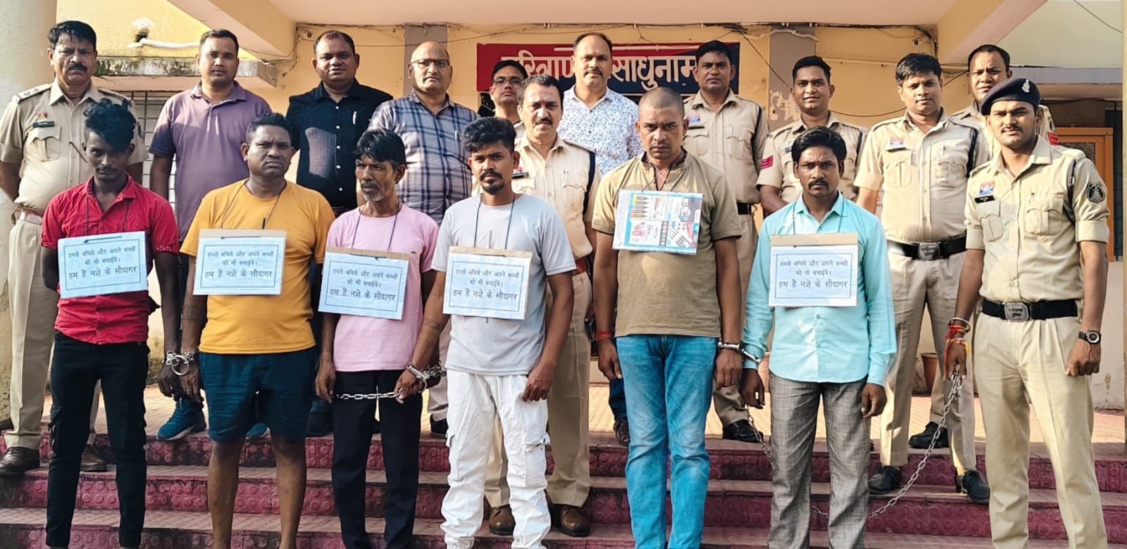 गया जो पृथक-पृथक नशा ब्राउन शुगर, नाइट्रा, गांजा, सिगरेट, बीड़ी, शराब का सेवन तथा बाहर राज्यों से ब्राउन शुगर को लाकर युवाओं को बेचते है तथा नशा कराते है जिस पर उक्त जाकिर खान, सोनू डांडे, अनिल खरसायन, विष्णु वैण्णव, किशोर धु्रव, अमित साहू की गिरफ्तारी कर शहर मे रैली जुलुस निकालकर तस्करों तथा ब्रिकी करने वालों को ‘‘हम है नशा के सौदागर, हमसे बचिये और अपने बच्चों को भी बचाईये’’ का नारा लगवाते हुये पुरे शहर मे पैदल घुमाया गया और युवा पीढ़ियो को जागरूक किया गया और प्रतिबंधात्मक कार्यवाही के तहत जेल दाखिल किया गया।
