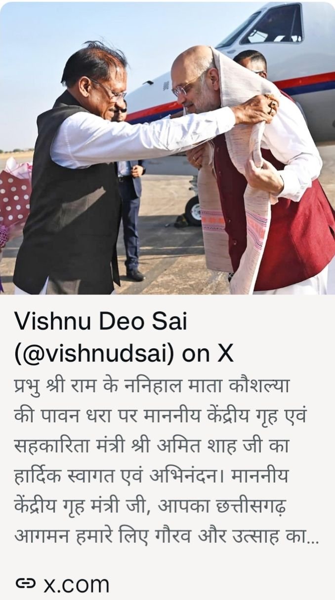 तीन दिवसीय छत्तीसगढ़ दौरे पर पहुंचे केंद्रीय गृह एवं सहकारिता मंत्री अमित शाह : मुख्यमंत्री विष्णुदेव साय ने स्वामी विवेकानंद विमानतल पर किया आत्मीय स्वागत