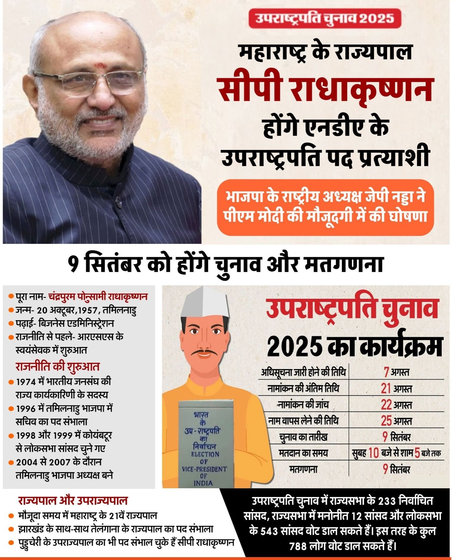 नई दिल्ली 17 अगस्त 2025:-  सी. पी. राधाकृष्णन को भारतीय जनता पार्टी के नेतृत्व वाले एनडीए गठबंधन ने उप राष्ट्रपति चुनाव के लिए अपना उम्मीदवार घोषित कर दिया है.उप राष्ट्रपति पद के लिए एनडीए के उम्मीदवार राधाकृष्णन वर्तमान में महाराष्ट्र के राज्यपाल हैं.सी पी राधाकृष्णन की उम्मीदवारी से जुड़ी जानकारी बीजेपी अध्यक्ष और केंद्रीय मंत्री जेपी नड्डा ने प्रेस कॉन्फ्रेंस में दी है.