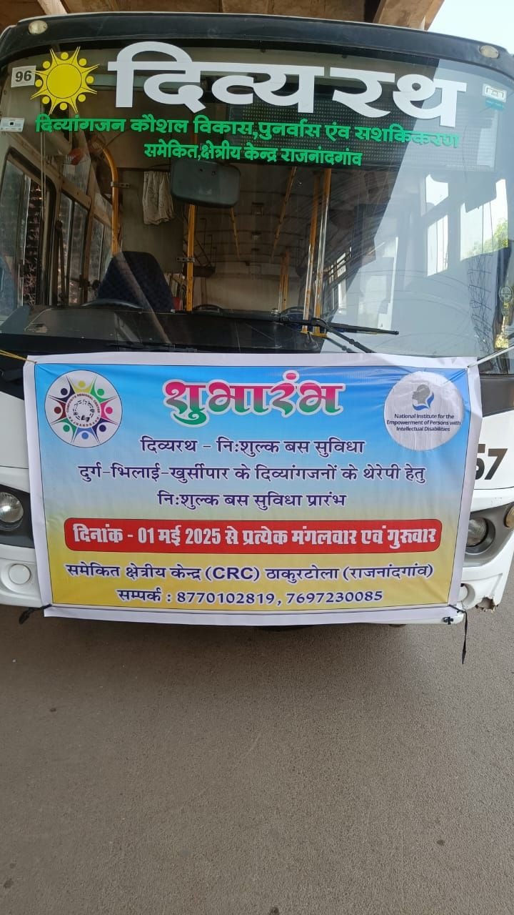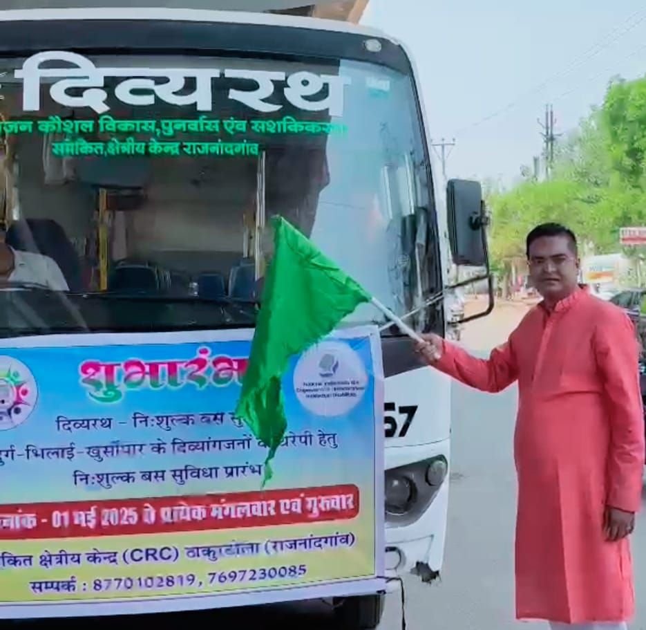भिलाई से राजनांदगांव “दिव्य रथ” नि:शुल्क बस, विधायक रिकेश ने हरी झंडी दिखा किया रवाना, हफ्ते में दो दिन चलेगी….बगैर किराया दिव्यांग और वरिष्ठजनों को कॉम्पोजिट रीजनल सेंटर राजनांदगांव आने-जाने शुरू हुई सुविधा